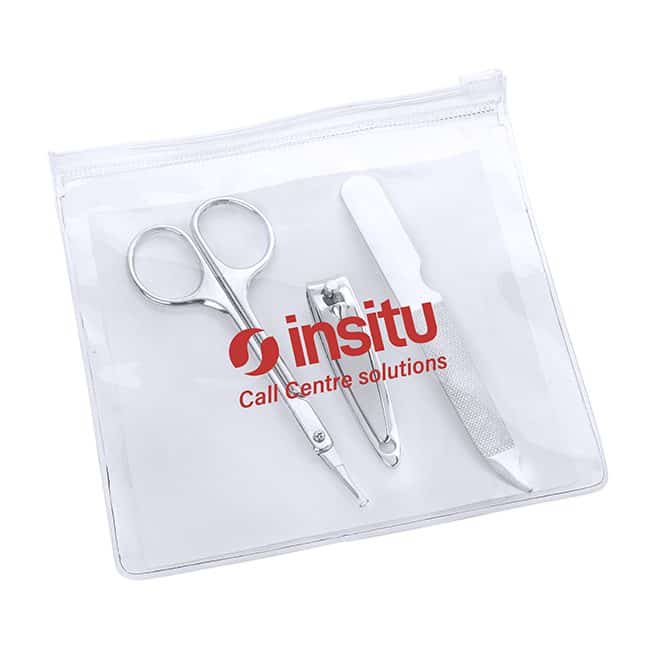 3pc Silver coloured nail care set. Includes nail file, scissors and clippers.