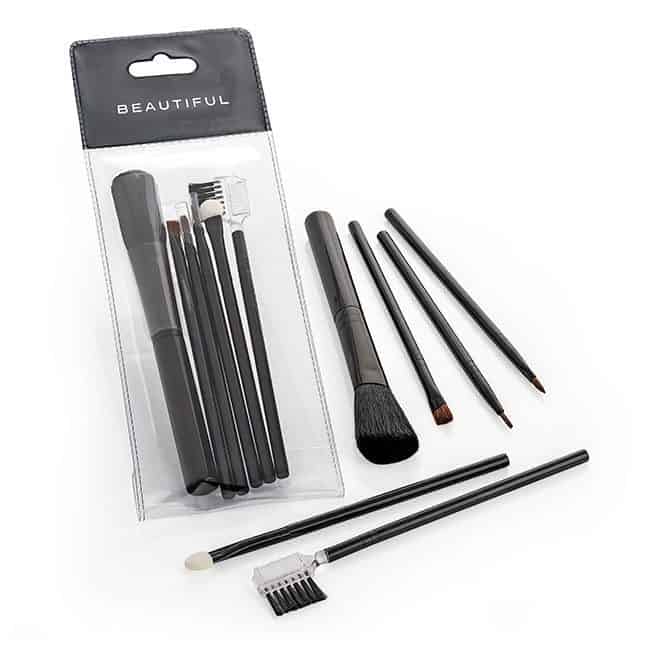 Perfect as a customer giveaway, this 6-piece basic black makeup includes a powder brush, eye shadow applicator, lip brush, lash comb/brow groomer, angled eye shadow brush and eyeliner brush. All come packed in a retail bag.