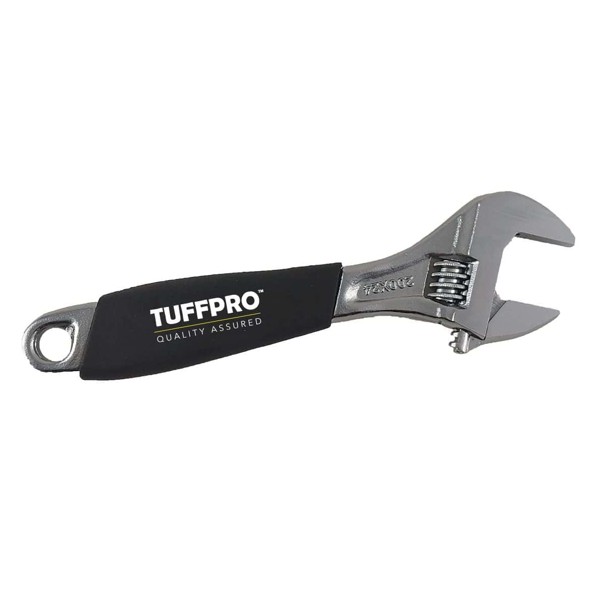 Adjustable chrome plated wrench with black rubber grip. Full colour branding to handle.