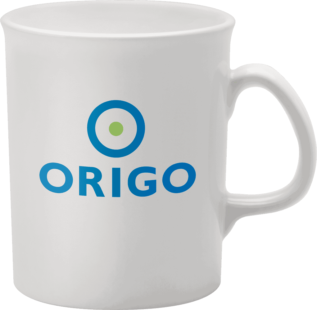 A straight mug with a slightly exaggerated lip with a comfortable sized handle, the perfect give away to sit on any desk.