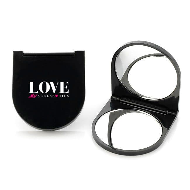 What every woman needs, a handy sized black double mirror plastic compact mirror. Also available in white (G5845) and green (G584504).