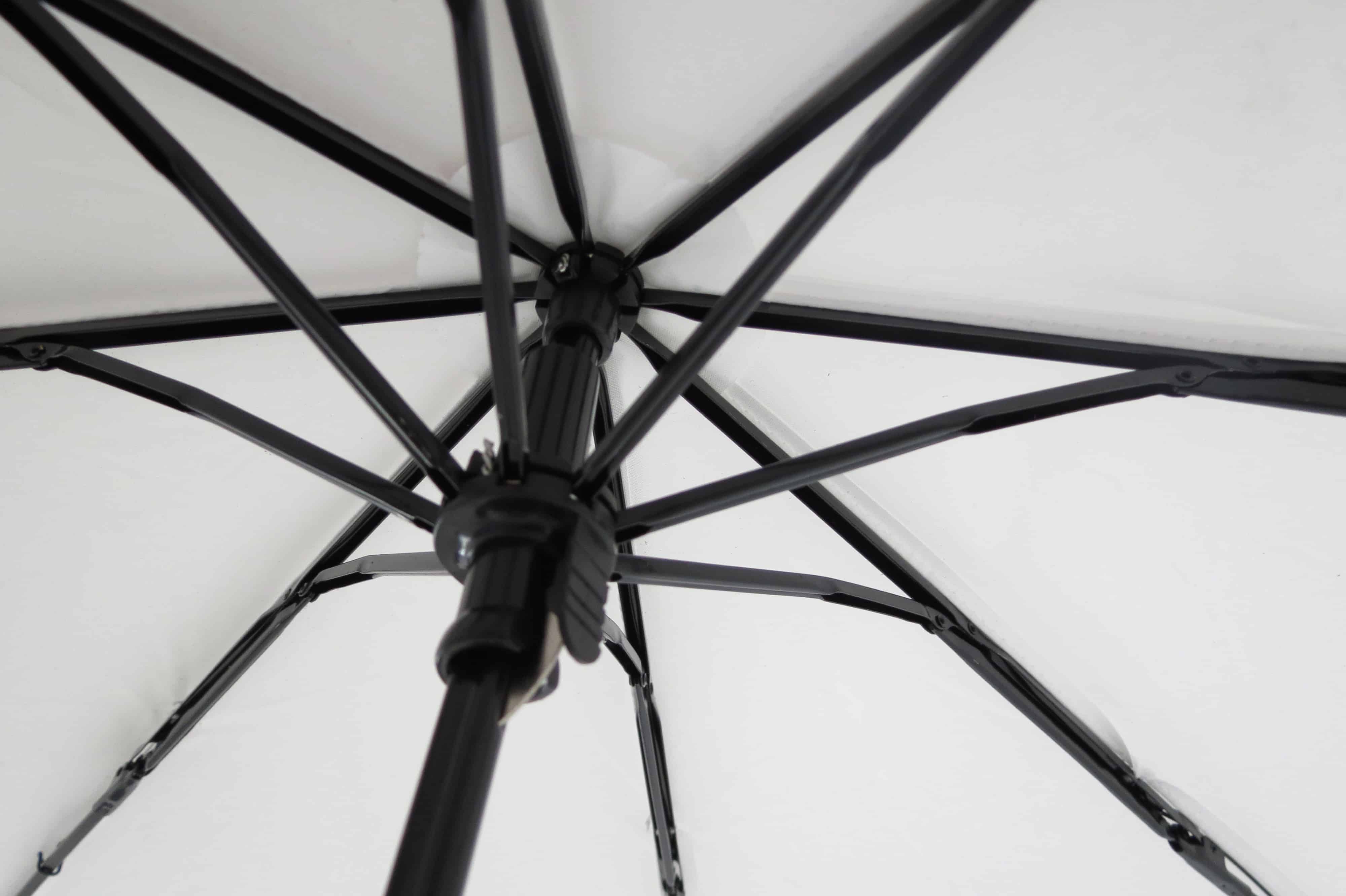 100% recycled PET canopy with four vented panels for increased stability in windy conditions, colour co-ordinated rubber coated handle with carry strap, colour co-ordinated sleeve