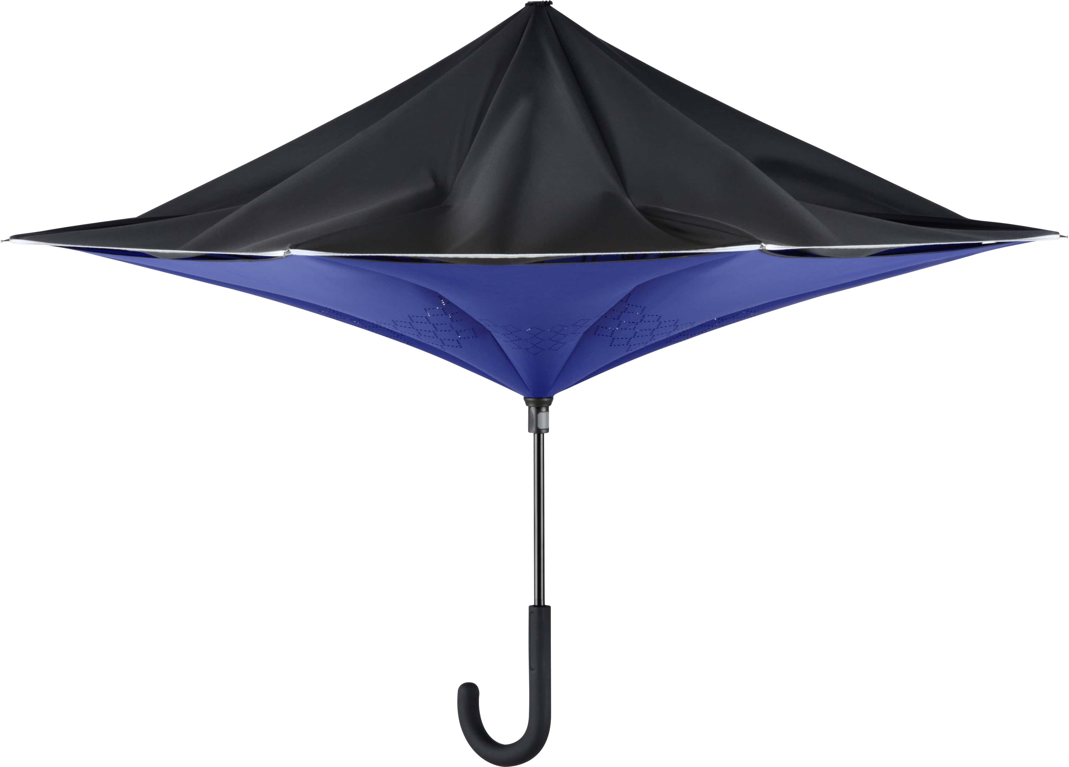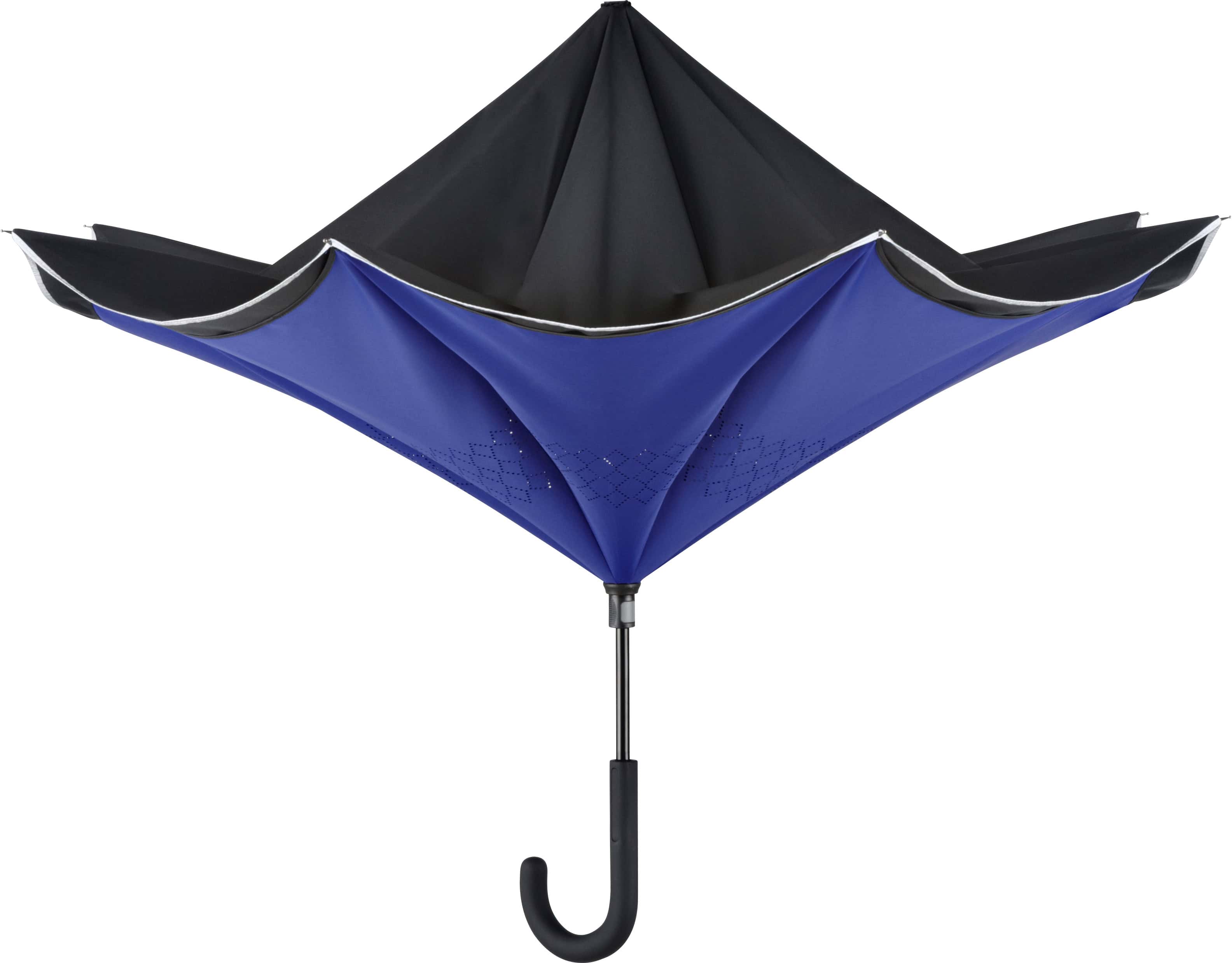 Easy to handle thanks to sliding safety runner, high-quality windproof system for maximum frame flexibility in stormy conditions, fibreglass frame opening from the inside out, flexible fibreglass ribs, double cover with lasered ventilation pattern to avoid the build-up of air, cover with trendy reflective piping in silver, soft-touch crook handle with promotional labelling option. Also available as mini umbrella (art. 5415).