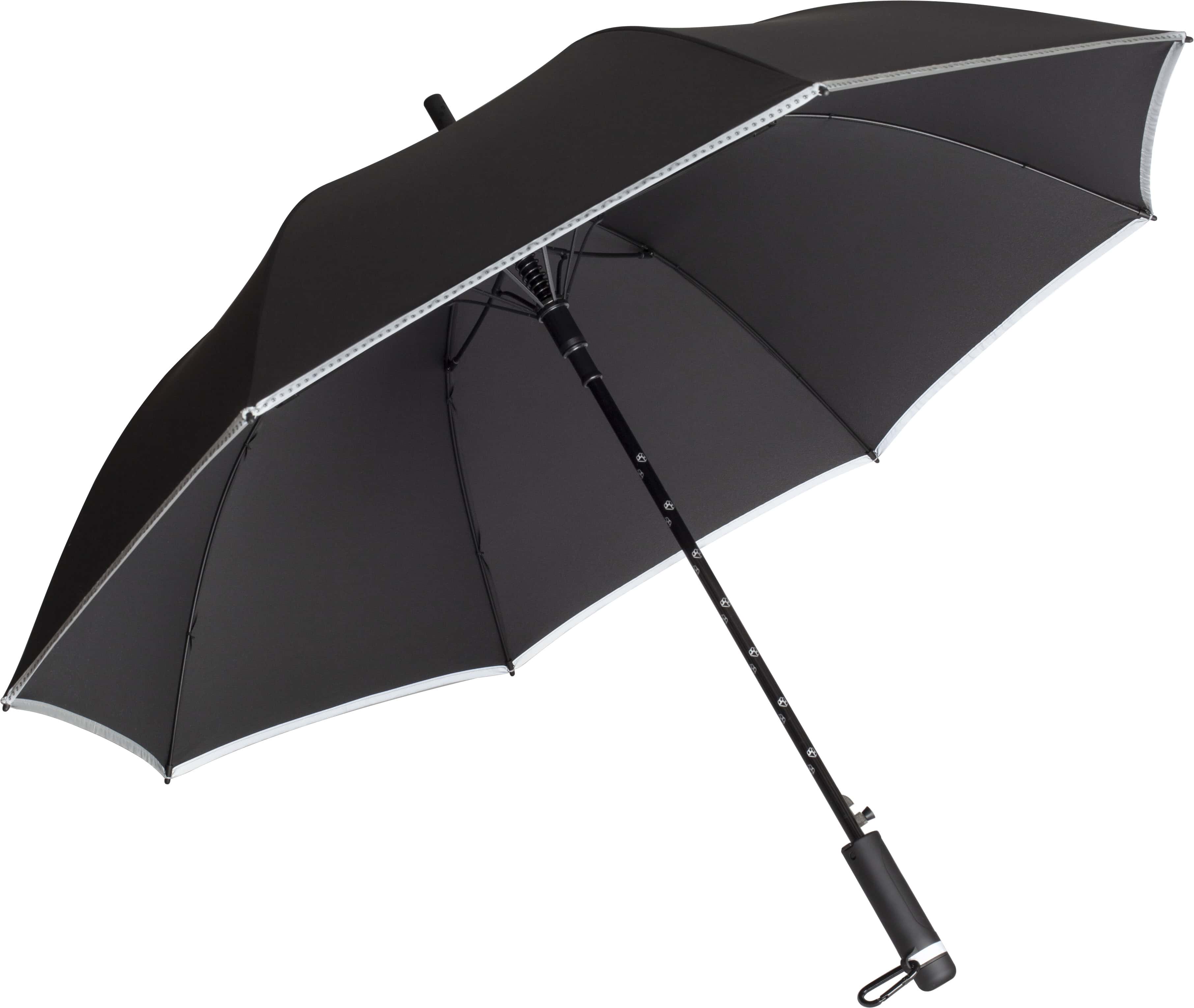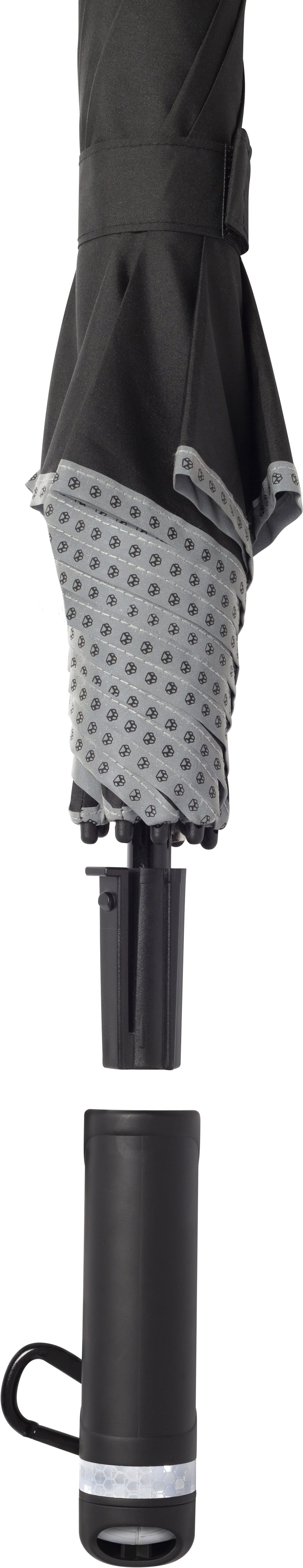 Convenient automatic function for quick opening, high-quality windproof system for maximum frame flexibility in stormy conditions, fibreglass shaft printed with silver paw prints, removable Soft-Feel handle with 15 bags in a roll and grey reflector stripes, handle with snap hook for fastening to belt, bag or dog leash, top can be unscrewed for refilling, push button with paw sticker and promotional labelling option, black top with paw prints, stylish silver reflector piping with black paw print