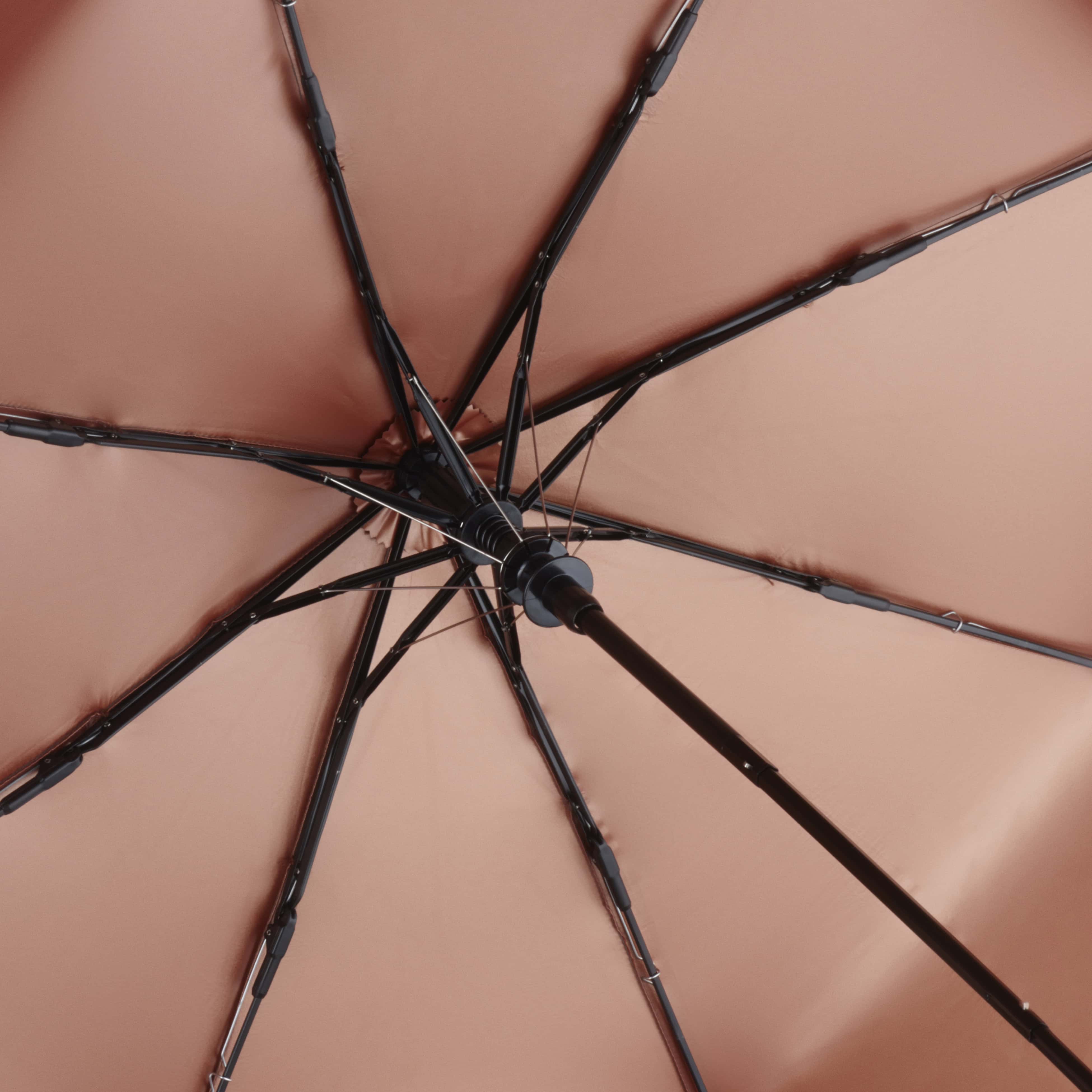Convenient automatic function for quick opening, high-quality windproof system for maximum frame flexibility in stormy conditions, harmonically combined two-coloured cover with coordinated interior and exterior colours, seam, rosette and closing strap in colour matching to interior colour of cover, inside coated cover, hand friendly Soft-Feel handle with integrated pushbutton and promotional labelling option, coloured handle strap. Also available as regular umbrella (art. 1159).