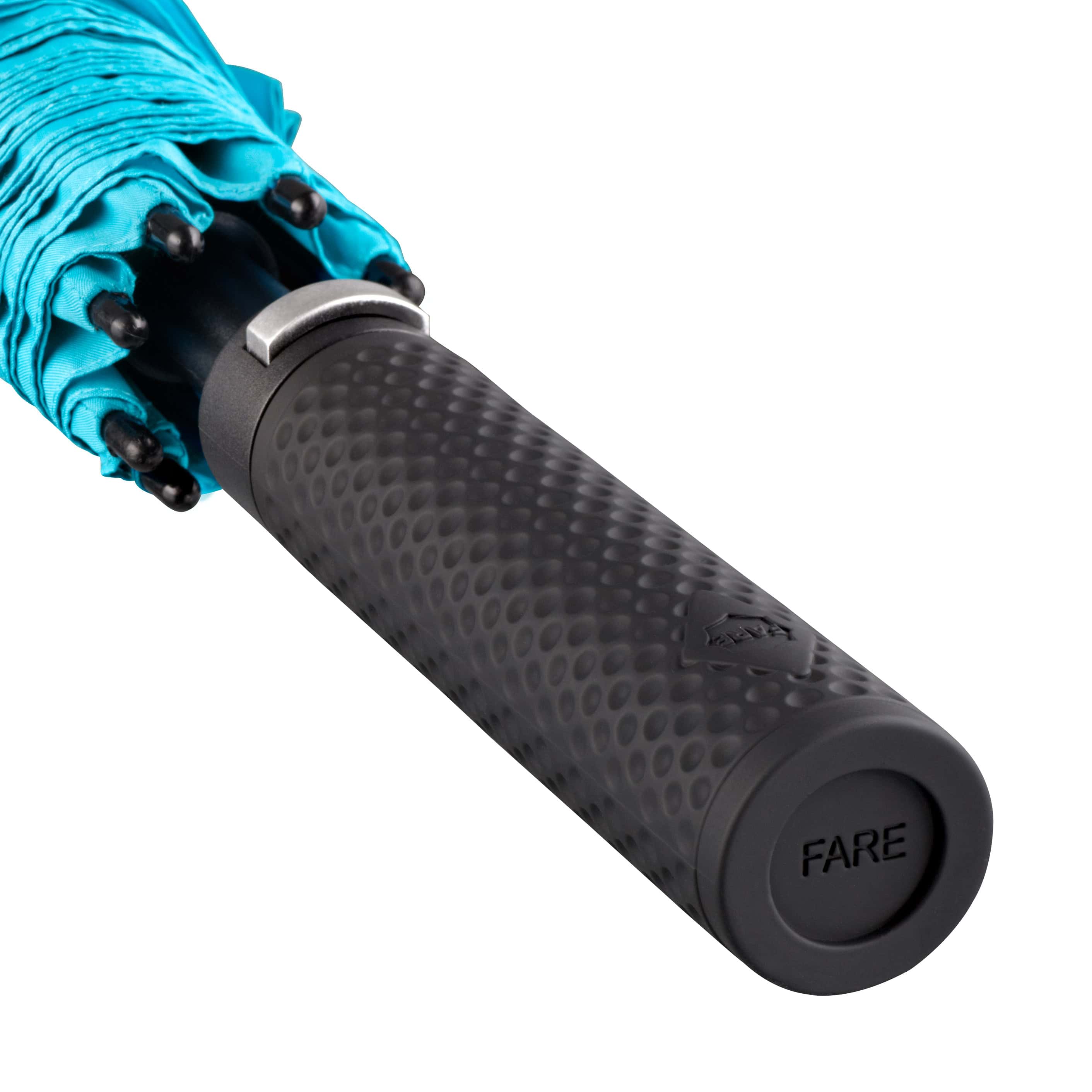 Convenient automatic function for quick opening, high-quality windproof system for maximum frame flexibility in stormy conditions, sturdy fibreglass shaft, flexible fibreglass ribs, overlapping ventilation cover to regulate pressure in stronger gusts, cover with two closing straps for optimal fixation in closed state, exclusive Soft-Touch handle with golf ball dimpled surface, silver push-button and promotional labelling option, convenient carry case with shoulder strap