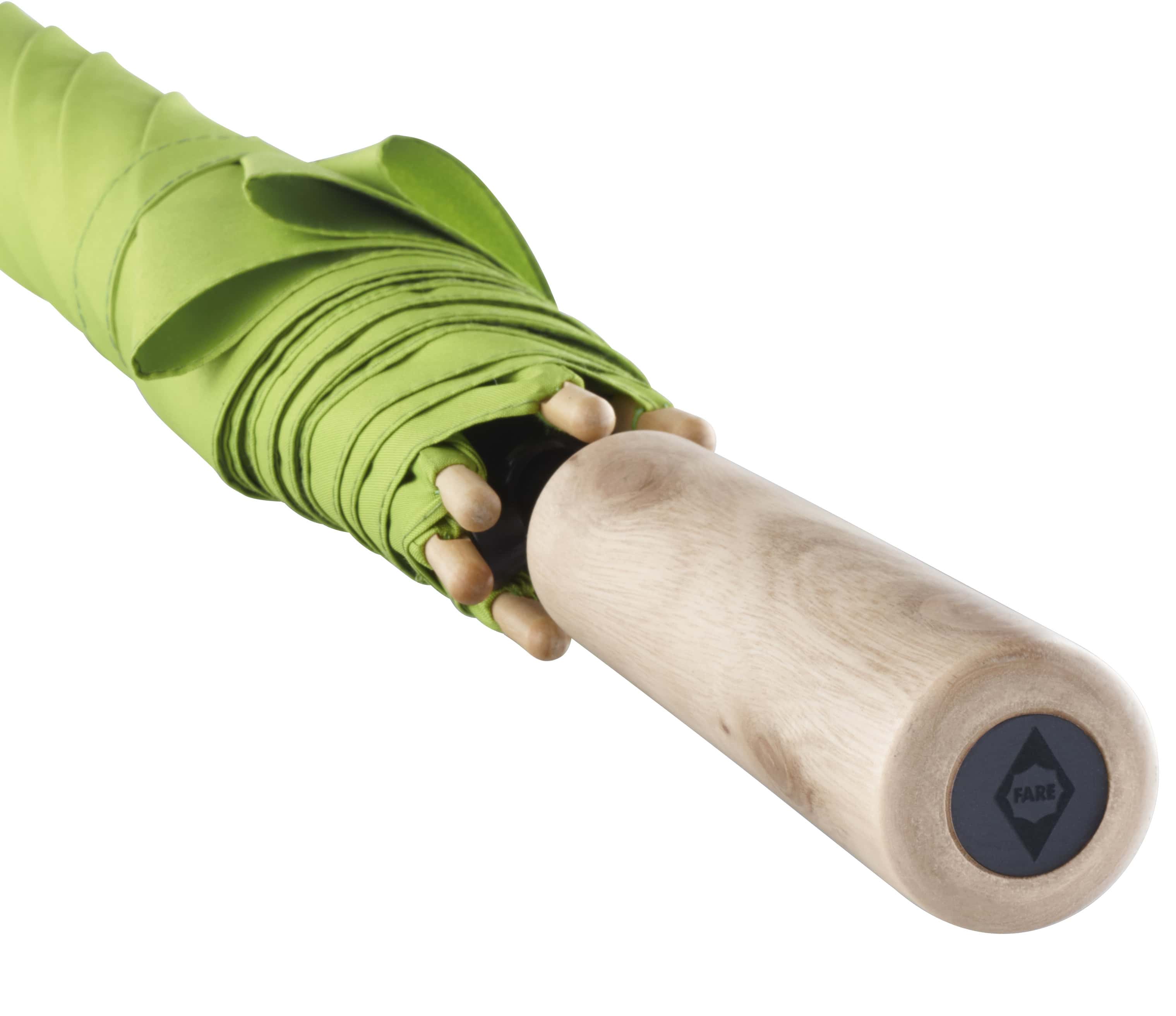 Convenient automatic function for quick opening, windproof features for higher flexibility and stability in windy conditions, flexible fibreglass ribs, polyester pongee cover material made of recycled plastics, depending on the colour, also available with waterSAVE® cover material, wooden tips, straight wooden handle with promotional labelling option, higher corrosion protection due to galvanized steel shaft