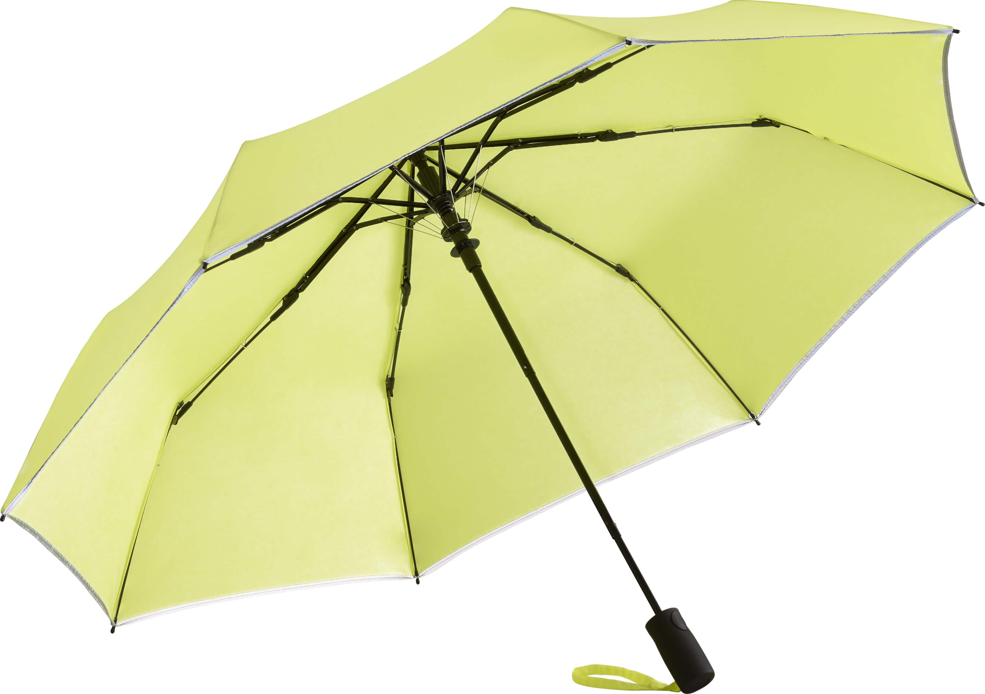 Convenient automatic function for quick opening, high-quality windproof system for maximum frame flexibility in stormy conditions, cover with trendy reflective piping in silver, Soft- Touch handle with shiny push-button and promotional labelling option, flashy sleeve with trendy reflective piping