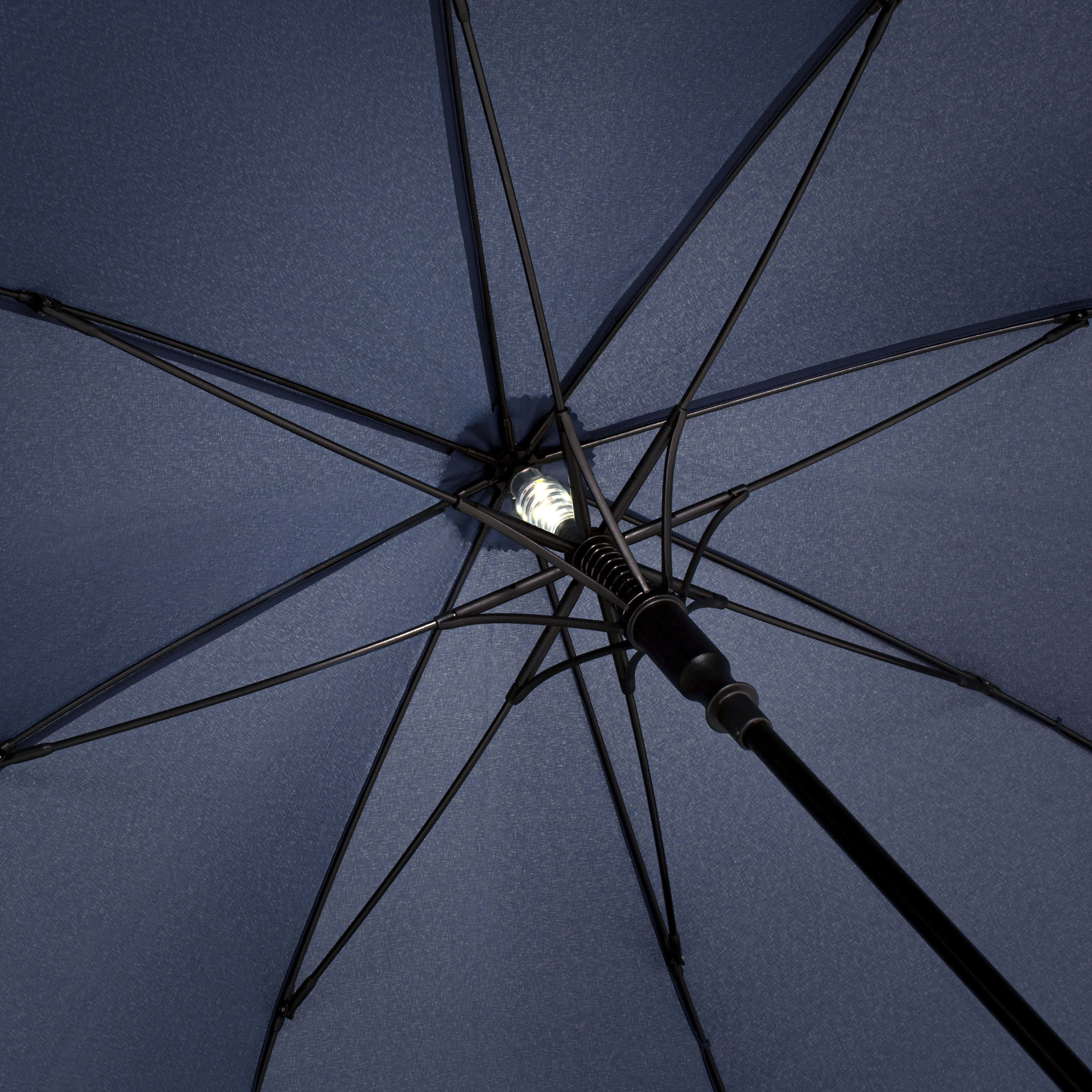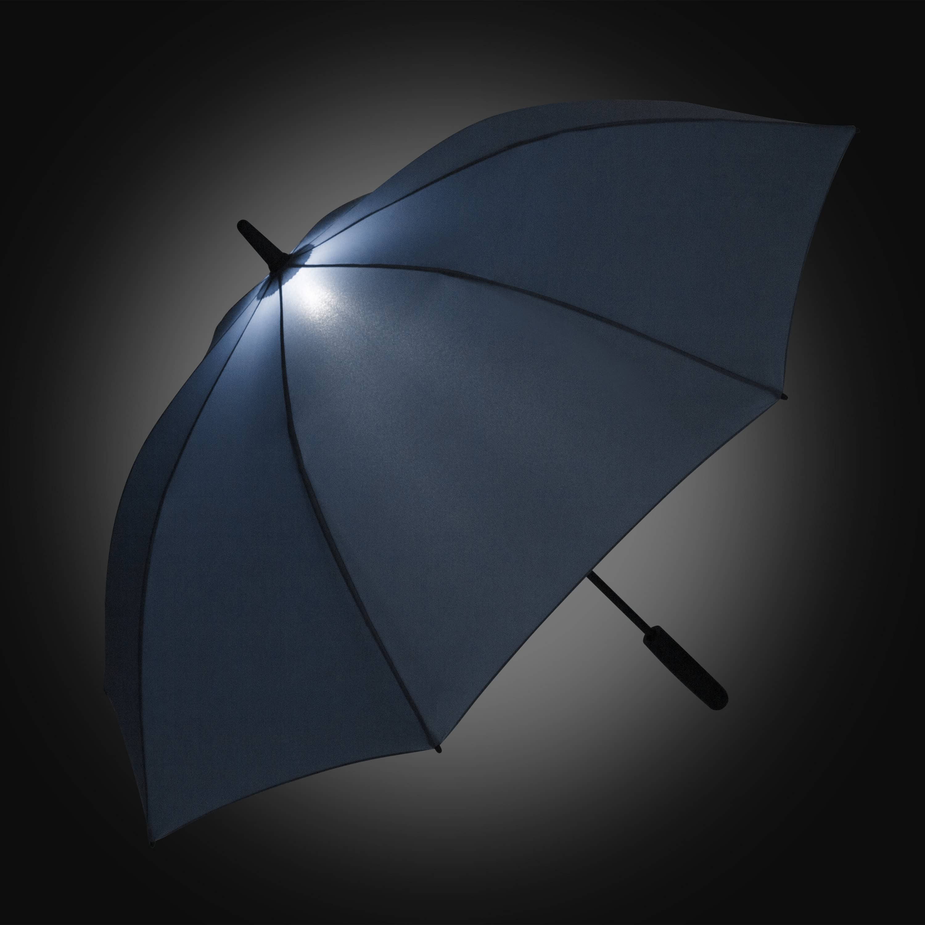 Convenient automatic function for quick opening, high quality windproof system for maximum frame flexibility in stormy conditions, flexible fibreglass ribs, Soft-Feel handle with integrated push button, button to turn off the light and promotional labelling option, higher corrosion protection due to black galvanised steel shaft, WEEE reg. no. DE 14360689