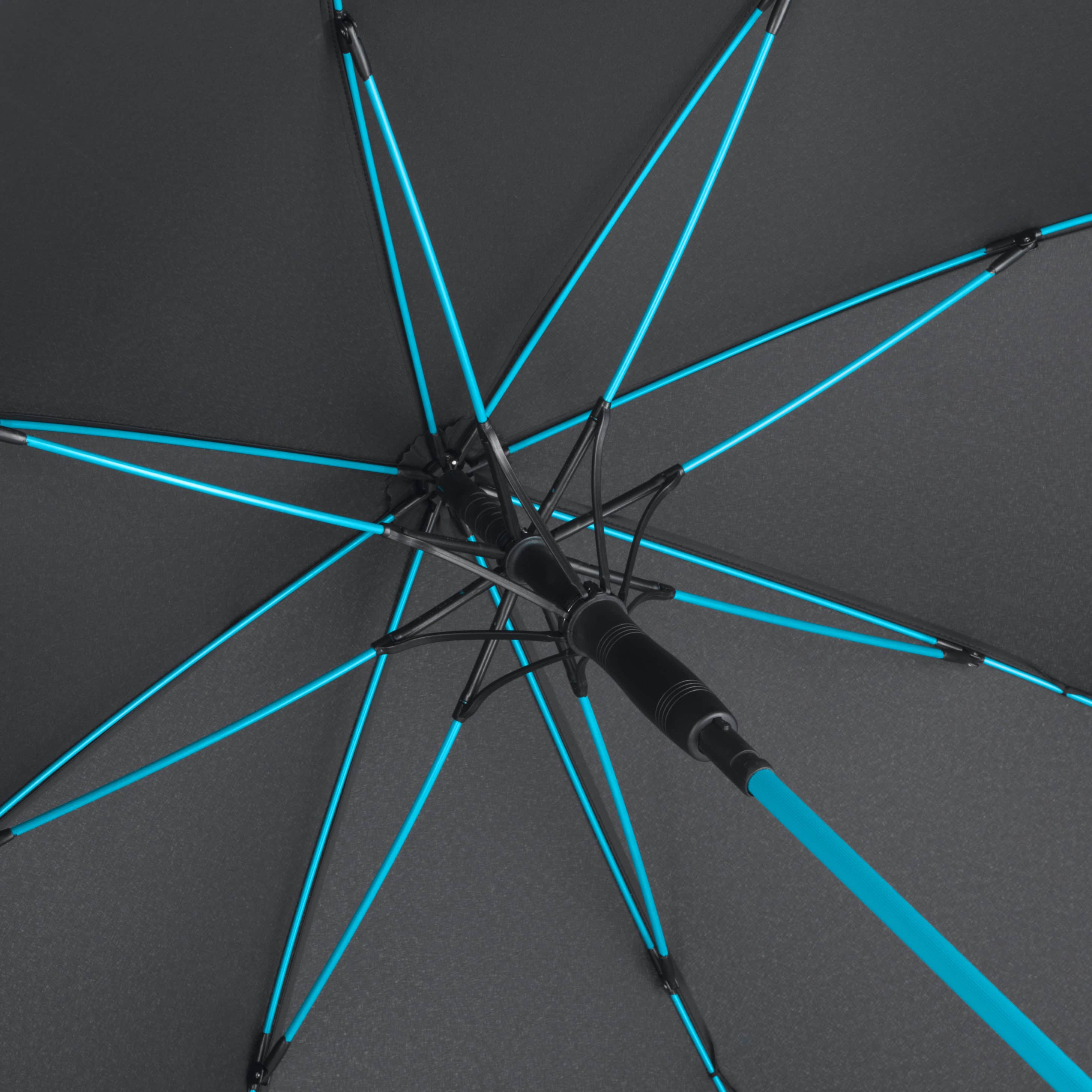 Convenient automatic function for quick opening, high quality windproof system for maximum frame flexibility, flexible fibreglass ribs, coloured steel stem, soft touch crook handle with coloured details and integrated push button and branded decal option