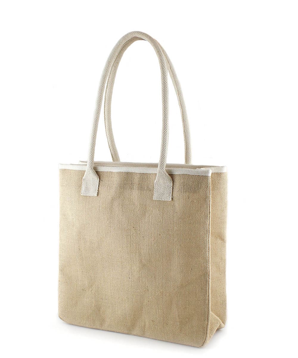 Natural laminated jute bag with cotton top trim & long cotton cord handles