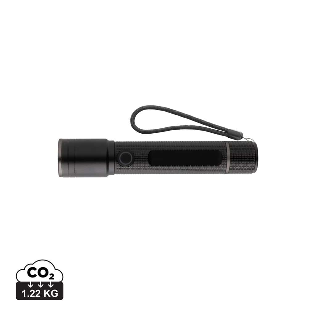 Functionality, performance and design all come together in this re-chargeable 3W torch made with RCS certified recycled aluminum. Total recycled content: 20% based on total item weight. RCS certification ensures a completely certified supply chain of the recycled materials. Because of its IP4 rating, it is weatherproof so can easily be taken outside. The powerful bulb creates up to 100 lumen and a beam that reaches up to 100 metres. The torch uses a re-chargable A-grade battery so no need to replace the batteries. Simply re-charge via your USB socket and the included RCS certified recycled type C cable. The high quality bulb comes with 5 modes including SOS function. The 500 mah battery allows a usage up to 4 hours on a single charge. Aluminum does not lose its characteristics in the recycling process and can be recycled endlessly. Item and accessories 100% PVC free. Packed in FSC mix packaging.