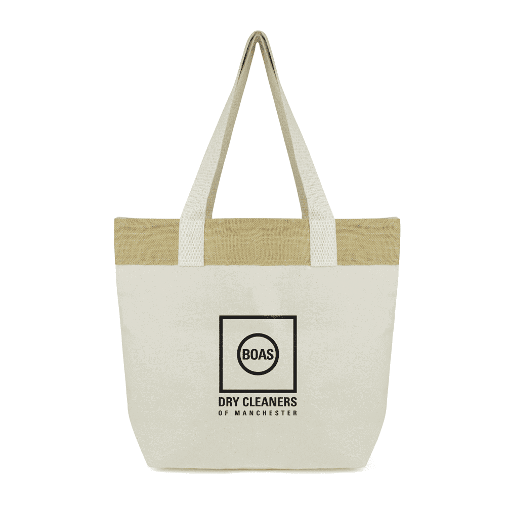 Large 10oz cotton eco-friendly shopper with natural jute stripe and long handles. This biodegradable and recyclable bag is a great giveaway for any event