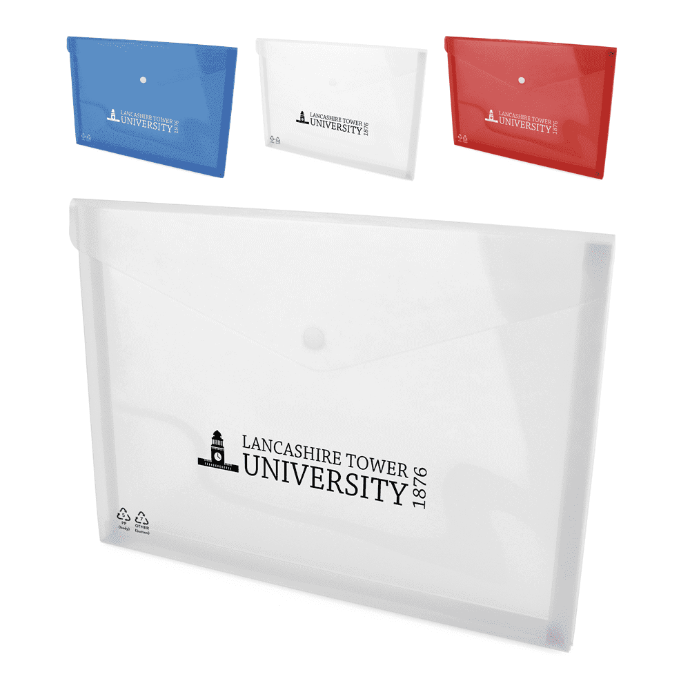 Translucent coloured PP plastic document folder with white press stud closure on the flap. It is easily wiped-clean, keeping documents securely together. Perfect for the home, office and student use.