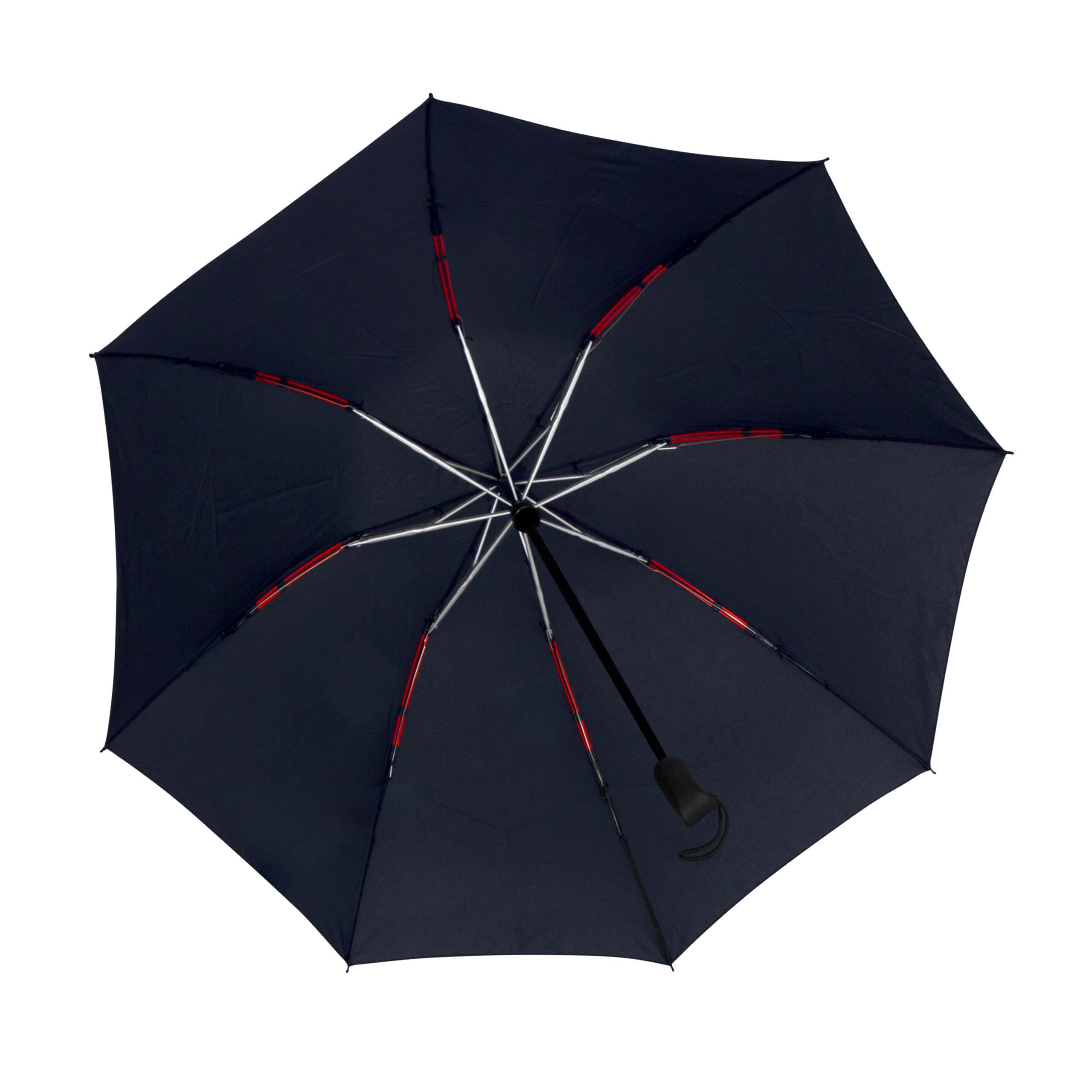 miniMAX foldable inside out umbrella, windproof, automatic open and close system, 3 piece, black metal pole and aluminum frame with red fiberglass and black metal rib ends, matching colored handle and with a casing.