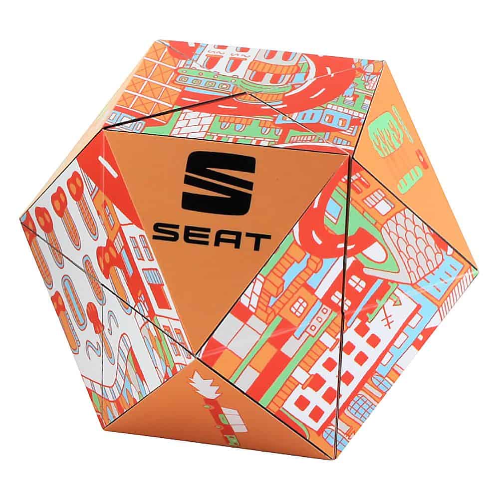 A stunning 70mm Magic Diamond printed full colour on all sides. This intriguing item consists of 8 connected blocks that continuously flip and fold in a seemingly never-ending loop. Each new fold reveals more vibrant artwork as it opens to reveal a diamond cavity inside and then back to a closed diamond again. The standard template creates 20 panels (6 large squares and 6 slightly smaller diamonds along with 8 small triangular corner panels). See our calendar templates here. The blocks are made of durable black HIPS recycled plastic covered with matt labels. Fitted with a magnetic closure and individually shrink-wrapped as standard. Optional extras: anti-scratch labels/glossy finish/plain white or branded paper box/AR. Also available in a 50mm size and an alternative premium style (please enquire for details). The Magic Concepts range represents the pinnacle of highly engaging and intelligently designed multisensory 3D media. These magical folding and twisting puzzles provide the perfect way to effectively communicate anything from product launches or anniversaries to company values and corporate training. Not to be confused with cheap copies, all cubes are of superb quality & long lasting finish worthy of premium brands.