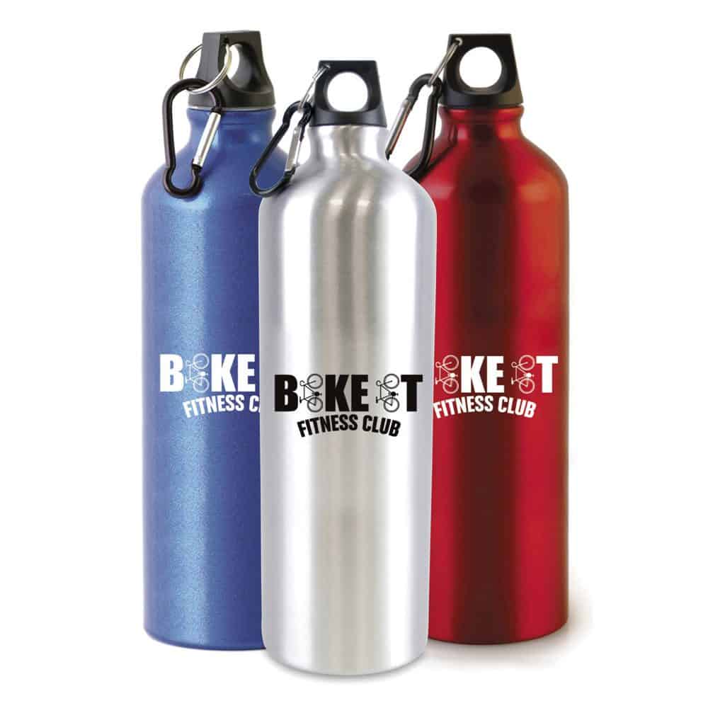 1 litre single walled, glossy aluminium sports bottle with a black PP plastic screw cap and black carabiner clip. BPA & PVC free.