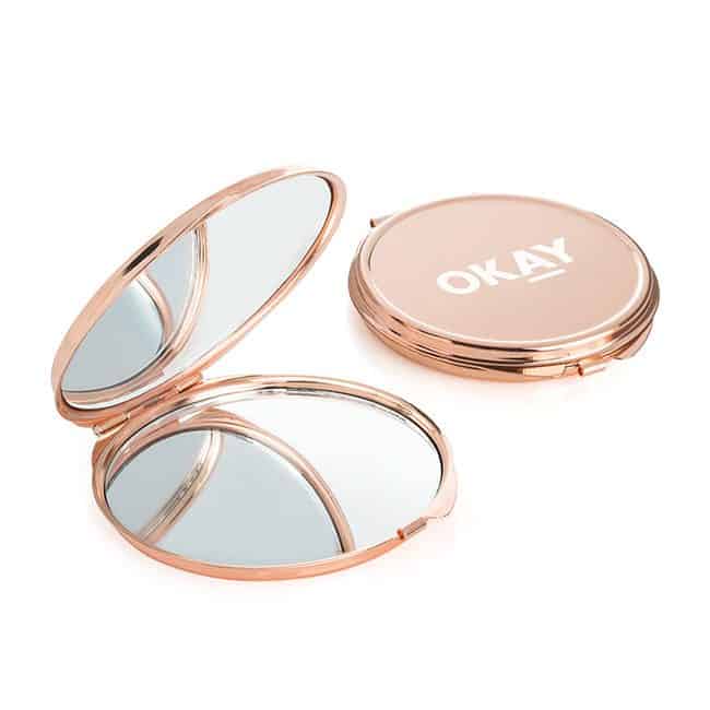 Double compact mirror in a rose gold colour, ideal for any handbag.