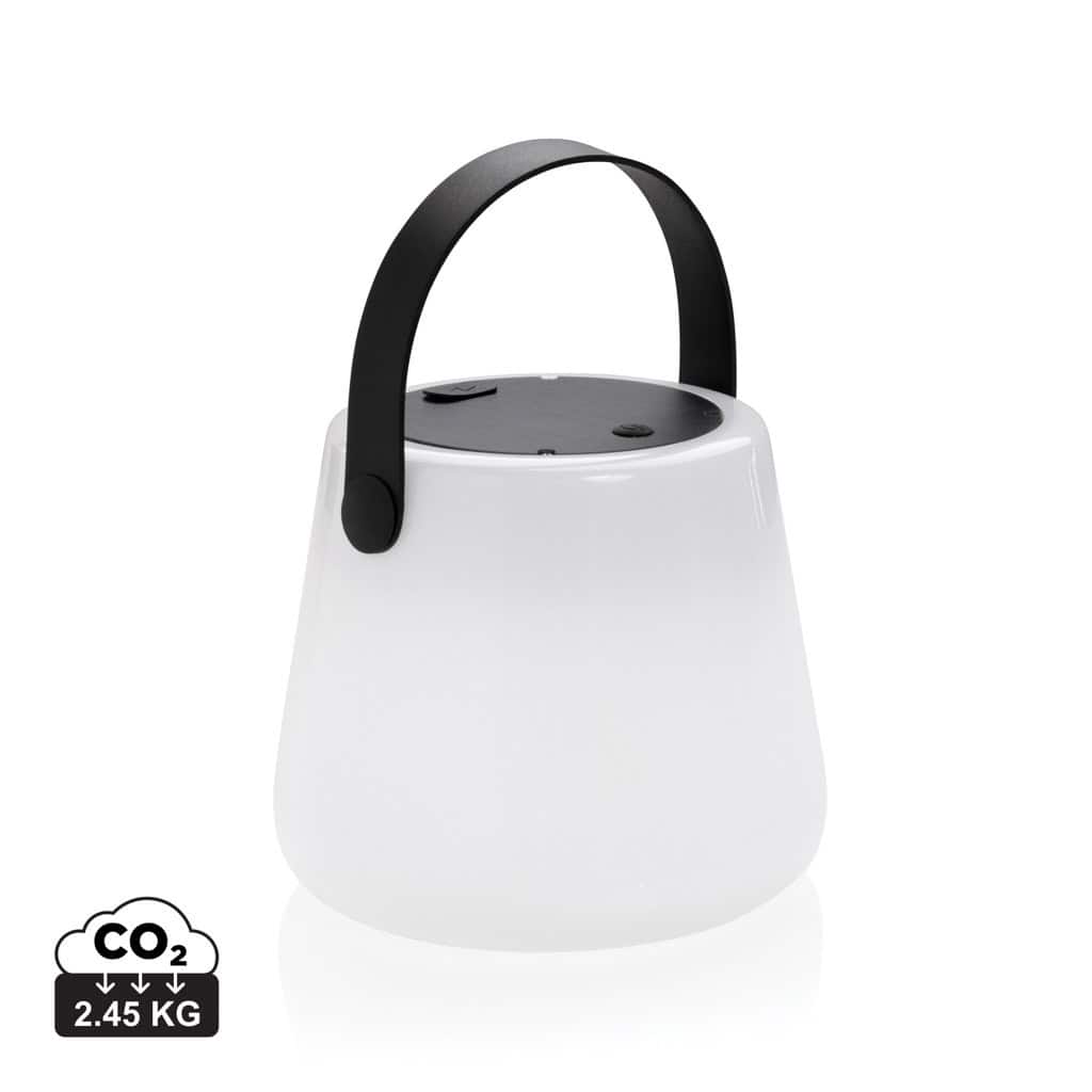 LED solar table light made with RCS certified recycled ABS. Total recycled content: 71% based on total item weight. RCS certification ensures a completely certified supply chain of the recycled materials. The torch uses a re-chargeable A-grade 1200 mah lithium battery so no need to replace the batteries. Simply re-charge via your USB socket and the integrated type C port. Including 80cm charging cable. Charging time by cable: 3 hours. 10 hours in bright sunlight will provide up to 3-4 hours of working time. Working time when fully charged: 20 hours. IPX 4 waterproof.