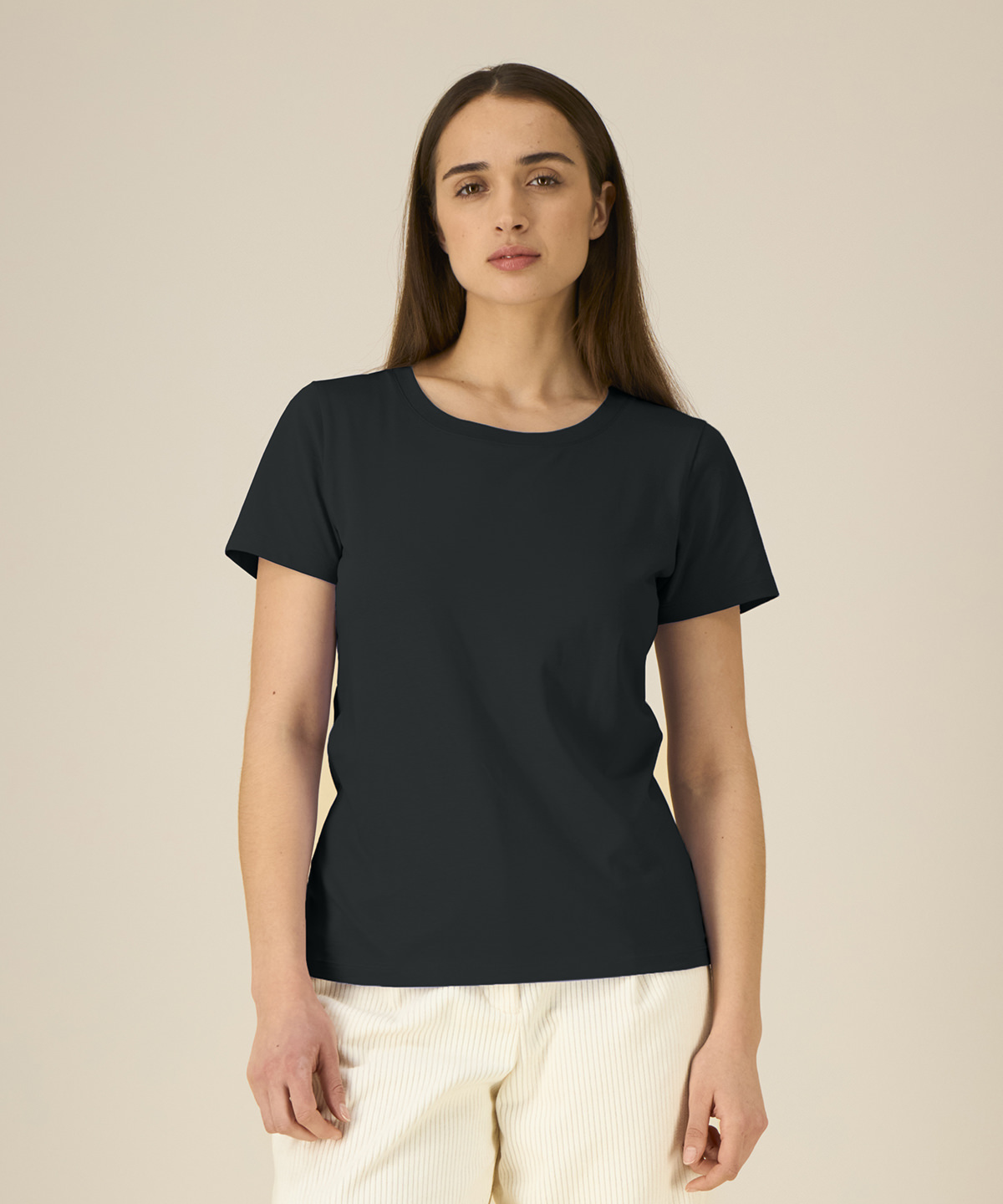 Iconic mid-light womens t-shirt. Fitted. Set-in sleeve. 1×1 rib at neck collar. Inside back neck tape in self-fabric. Narrow twin-needle topstitch at sleeve cuff and hem.