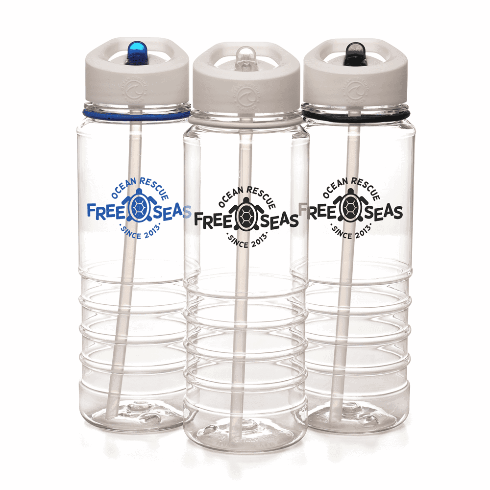 OBP certified (Ocean Bound Plastic) 750ml single walled, transparent made from 98% recycled ocean bound plastic with straw, lid with handle, ring and fold down sipper all made from Ocean Bound Plastic. The bottom half of the bottle is ridged for ease of grip. BPA & PVC free.