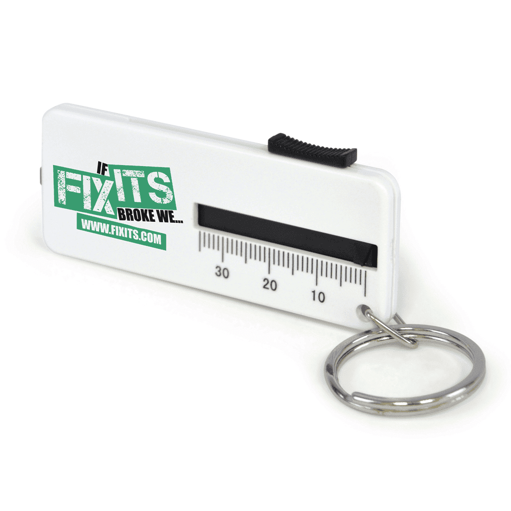 Plastic tyre gauge with split ring keyring so it can be easily attached to your car keys. Simply extend the gauge and place it onto the surface of the tyre to measure the depth of your tyre treads. Gauge measures up to 35 millimetres. A great practical promotional item for tyre companies.