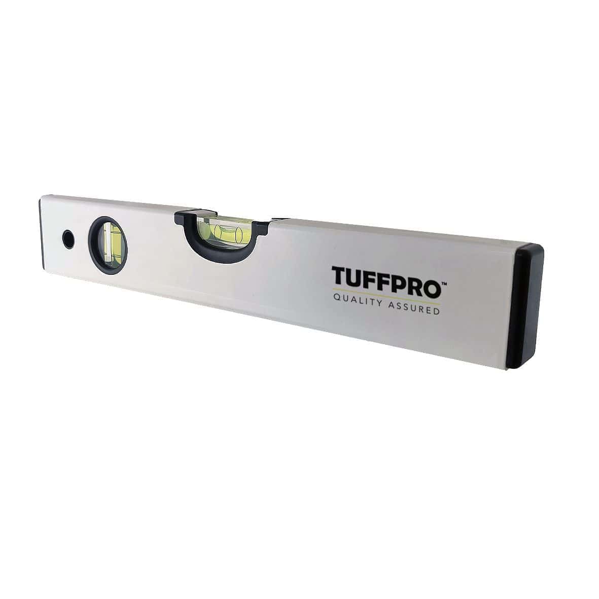 300mm aluminium spirit level in white with horizontal and vertical bubble vials. A must have essential for any toolkit. Accuracy 1:1000.
